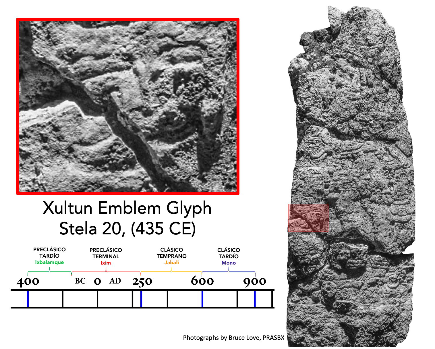 Early Classic period Stela 20 located in Plaza B with Xultun’s emblem glyph Baax Witz’ Ajaw, or “chert / hammer-stone mountain,” ceramic vessels from Xultun Burial 10, and detail of 4th-5th century sculpted frieze from Xultun’s 12F19 complex, photos PRASBX.