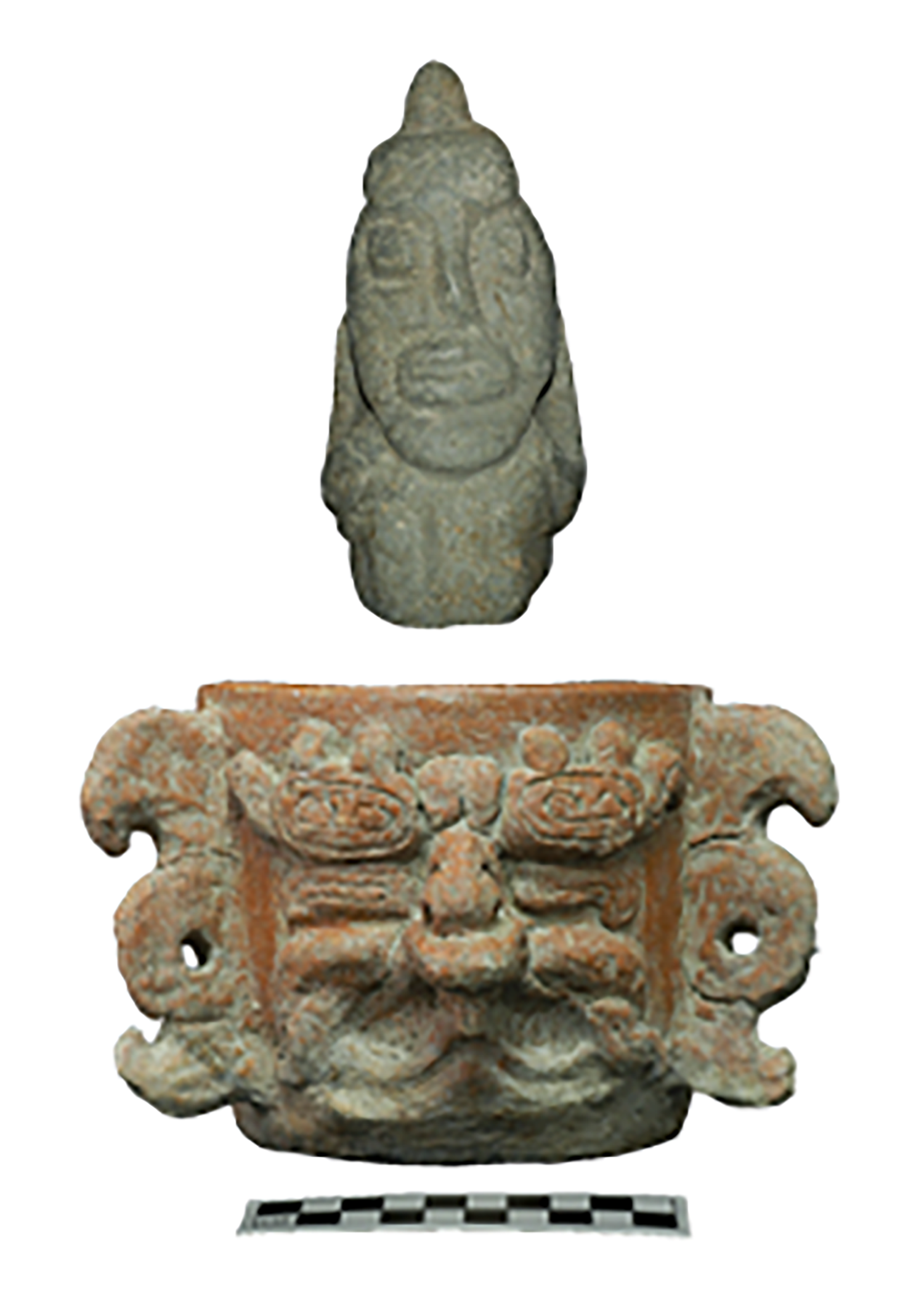 San Bartolo is a Late Preclassic period community. Although evidence of occupation and farming are documented earlier, all civic-ceremonial complexes follow a similar pattern with their earliest construction phases dating to between 400-200 cal BCE, with the central acropolis of Las Ventanas and the Tigrillo palace founded in the 5th century BCE. In addition to the wall paintings of the Las Pinturas complex, religious beliefs and political structure during this period are understood through ritual deposits, including this small sculpture and ceramic vessel (left) depicting two deities associated with rain (top) and creation (bottom), as well as architectural trends, household material culture, and subsistence practices.